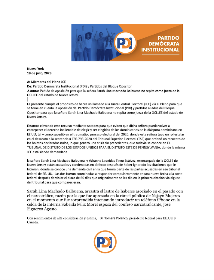 “La presente cumple el propósito de hacer un llamado a la Junta Central Electoral (JCE) vía el Pleno para que se tome en cuenta la oposición del Partido Demócrata Institucional (PDI) y partidos aliados del Bloque Opositor para que la señora Sarah Lina Machado Balbuena no repita como jueza de la OCLLEE del estado de Nueva Jersey”, expresa textualmente la comunicación fechada el 18 de julio en Santo Domingo, RD.