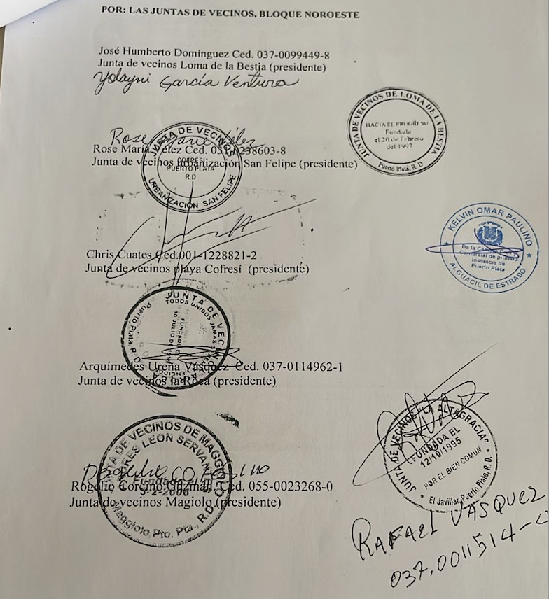 La oposición comunitaria cuenta con un respaldo amplio y formal. Los documentos están firmados por trece miembros del Comité Gestor de Moradores de la Urbanización Ciudad Universitaria y por los presidentes de al menos diez juntas de vecinos del Bloque Noroeste de Puerto Plata, lo que confiere peso institucional a la denuncia. Las actuaciones legales fueron notificadas por los alguaciles José Alfredo Molina y Kelvin Omar Paulino, otorgando carácter jurídico y oficial al reclamo.