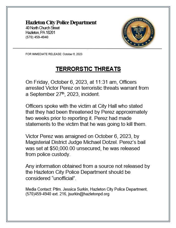 La policía de Hazleton publicó en su página oficial y redes sociales el acta da arresto de Víctor Pérez bajo cargos de AMENAZAS TERRORISTAS la que pasamos a traducir al español y transcribir textualmente a continuación: