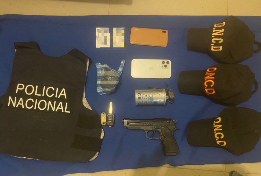 Durante la intervención, los agentes del orden les ocuparon un chaleco antibalas de la Policía Nacional, tres gorras con insignias de la Dirección Nacional de Control de Drogas (DNCD), una bomba lacrimógena, una pistola marca Mackco sin documentos legales, y varias porciones de una sustancia vegetal presumiblemente marihuana.