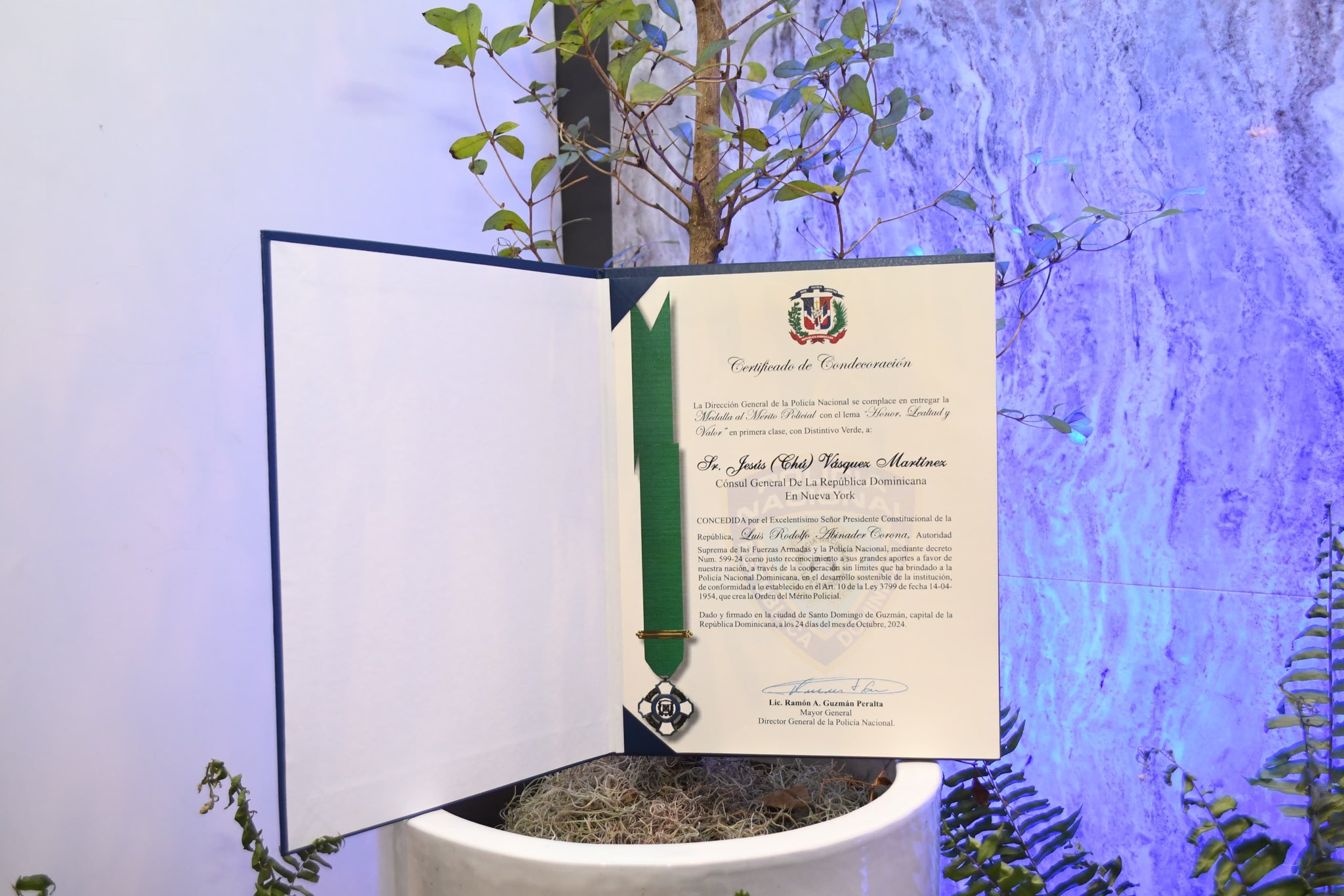 Nueva York: El honorable cónsul dominicano en esta ciudad, Jesús Vásquez Martínez (Chú), fue galardonado la tarde del jueves con la Medalla al Mérito Policial por parte de la Dirección General de la Policía Nacional y el Ministerio de Interior y Policía de la República Dominicana.