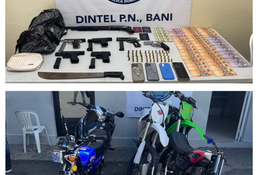 Baní, Peravia. – La Policía Nacional, a través de la Subdirección Regional Sur Central de Inteligencia (DINTEL), en coordinación con el Ministerio Público y con el apoyo de la Policía Preventiva, incautó varias armas de fuego, motocicletas, pasaportes, celulares y dinero en efectivo durante tres allanamientos realizados en distintos sectores de este municipio, donde además fueron detenidas dos personas.