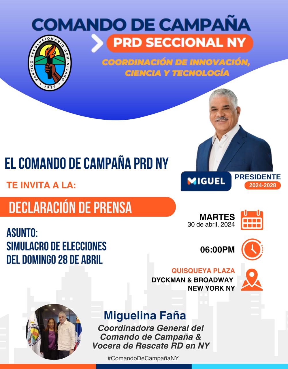 Dijo que la rueda de prensa está siendo coordinada por Miguelina Faña, Coordinadora General del Comando de Campaña & Vocera de Rescate RD en Nueva York, en la que se darán mayores detalles relacionados con la decisión del PRD y la campaña de Yomare Polanco de no participar en el “Simulacro de Elecciones” que organizaron los mencionados grupos de medios.