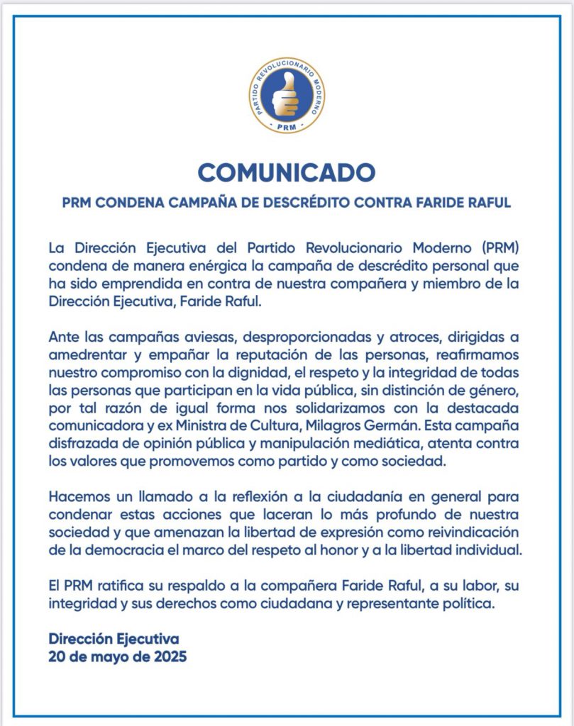 El Partido Revolucionario Moderno (PRM) rechaza firmemente una campaña de descrédito personal contra Faride Raful, miembro de miembro de la Dirección Ejecutiva.