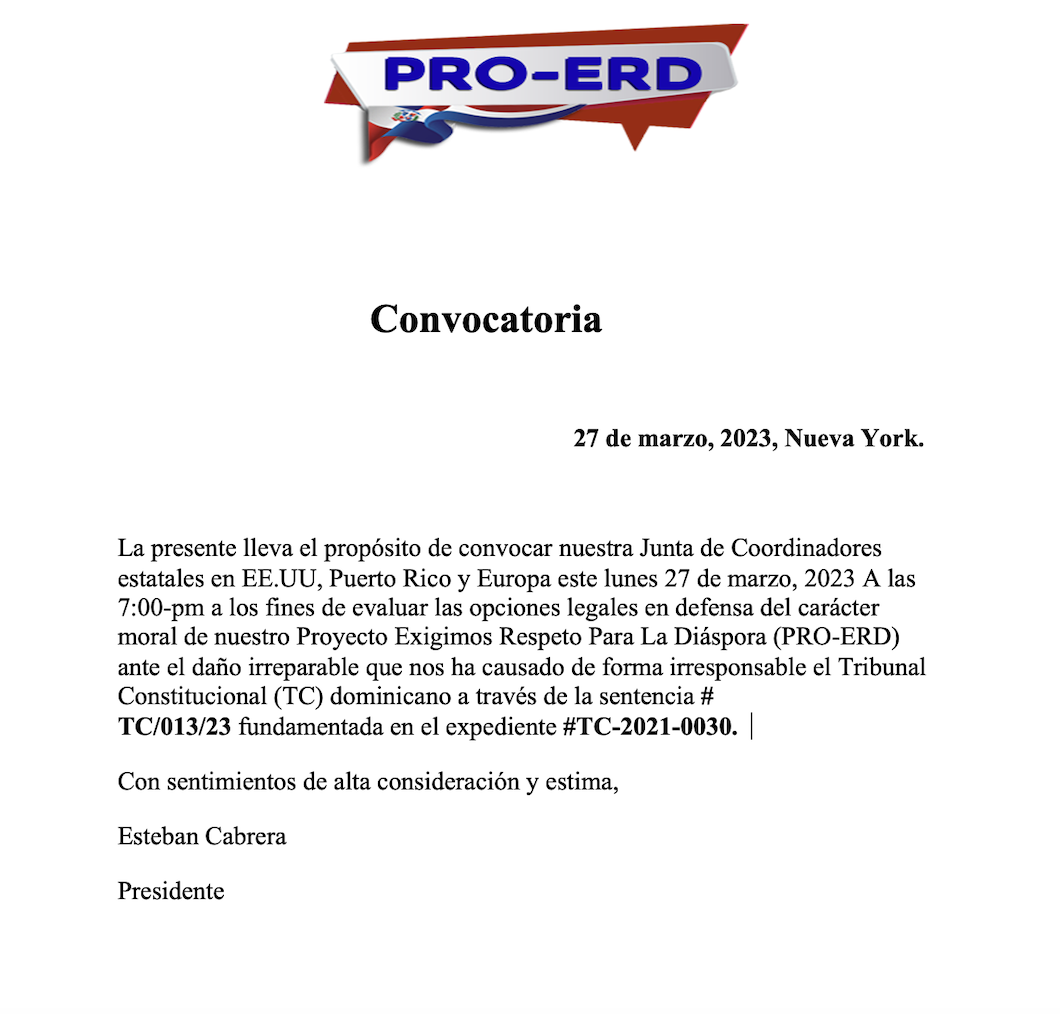 En dicha sentencia, el TC mencionó al Proyecto Exigimos Respeto para la Diáspora (PRO-ERD) de forma reiterada y presentándolo como una entidad de naturaleza proselitista o una organización, partido o movimiento político, causando un severo daño al buen nombre de (PRO-ERD), que lejos de ser una entidad política; su naturaleza es caritativa, registrada en el estado de Pennsylvania, bajo el tipo de registro de “Corporación Nacional sin fines de lucro, bajo el registro ID: 0003640218. Con sus artículos de incorporación: sin fines de lucro. De fecha 02/08/2023.