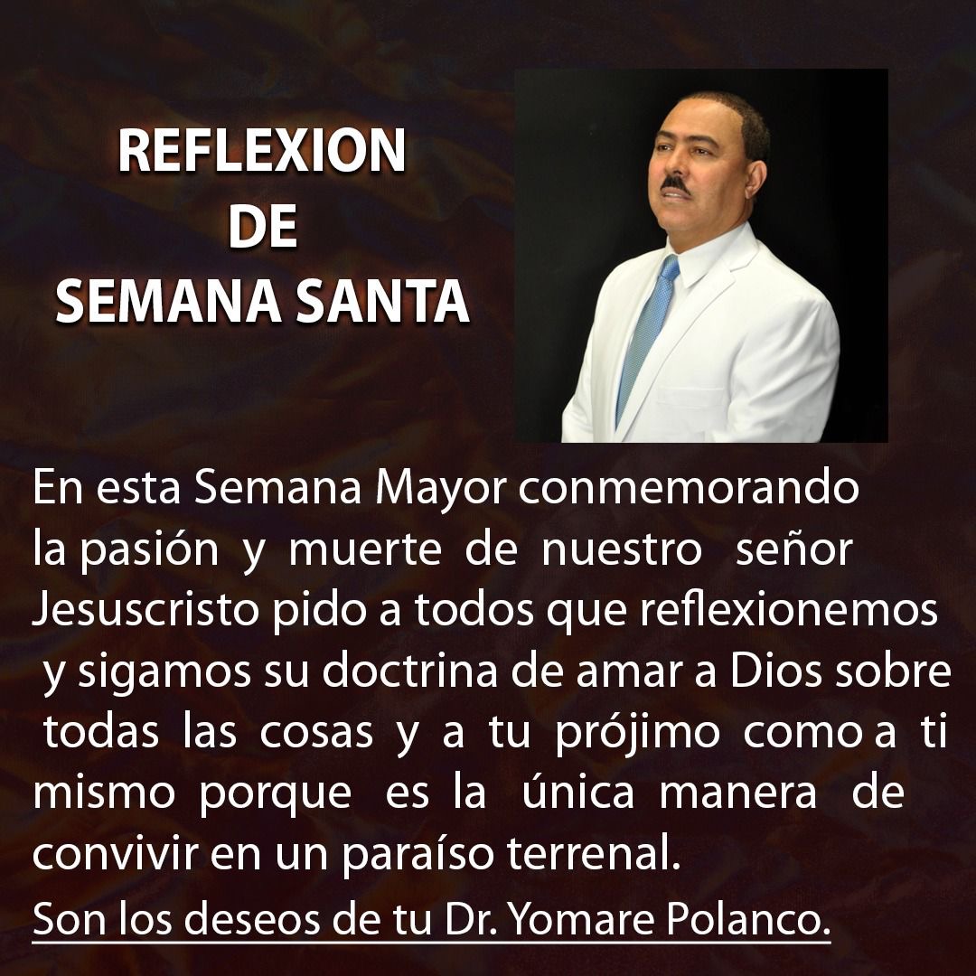 “En esta Semana Mayor conmemorando la pasión y muerte de nuestro señor Jesucristo pido a todos que reflexionemos y sigamos su doctrina de amar a Dios sobre todas las cosas y a tu prójimo como a ti mismo porque es la única manera de convivir en un paraíso terrenal”, escribió el Dr. Yomare Polanco.