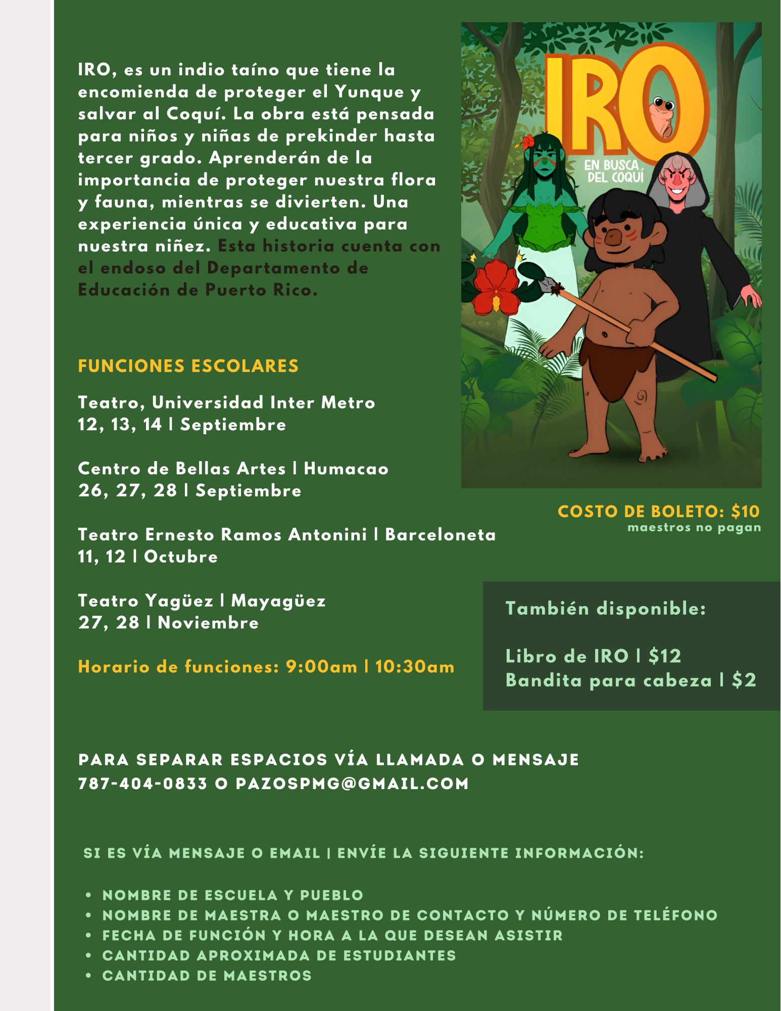 García Ortiz informó que la pieza teatral es una interactiva y educativa de su autoría, dirigida a niños, que busca fomentar la protección de la flora y fauna puertorriqueña. IRO es un indio taíno que vive en las montañas del Yunque y es quien tiene la encomienda de proteger dicho lugar y salvar al coquí. La historia se desarrolla en esta legendaria montaña puertorriqueña, que nuestro protagonista busca proteger del malvado personaje llamado, El Mal.