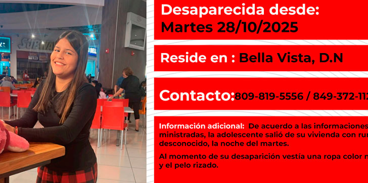 SANTO DOMINGO. – Familiares, reportaron como desaparecida a Jade Durán, de 14 años de edad, residente en el sector Bella Vista.