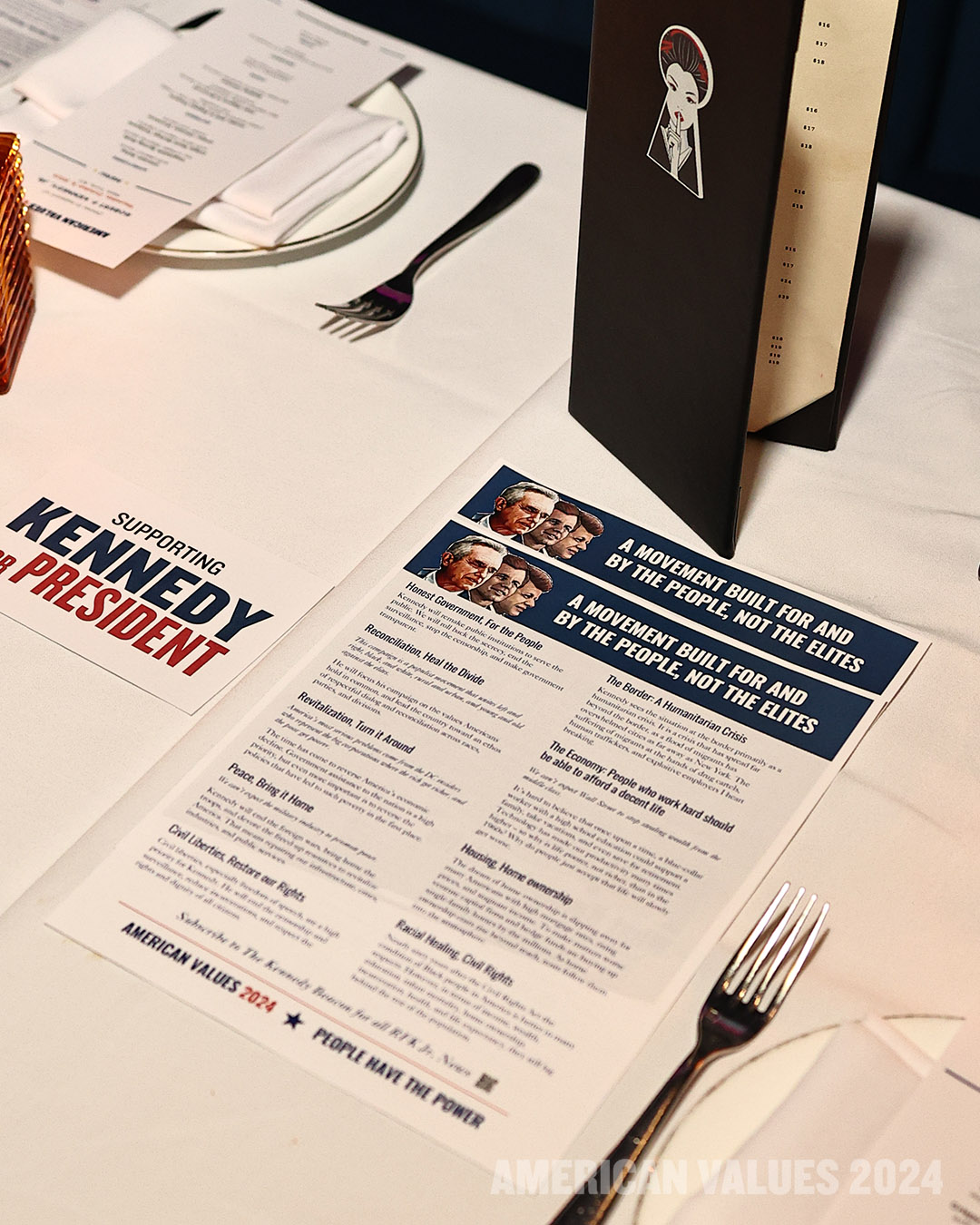 El American Values 2024 Super Pac organizó un importante encuentro con líderes de la comunidad afroamericana. Entre los anfitriones de la cena se encontraba el propietario de un negocio local y líder de AV24, Justin Faust, quien estaba ansioso por saber por qué los asistentes apoyan a Kennedy. Uno de los respaldos provino del cabildero Joshua López, quien comentó: “Estoy aquí apoyando a Kennedy 2024. Creo en la democracia. Creo en la libertad de expresión. Me alegra que el Sr. Kennedy se postule. Necesitamos unas primarias competitivas del Partido Demócrata. Necesitamos que la gente compita por ideas que compitan por los votos de Kennedy 2024.”