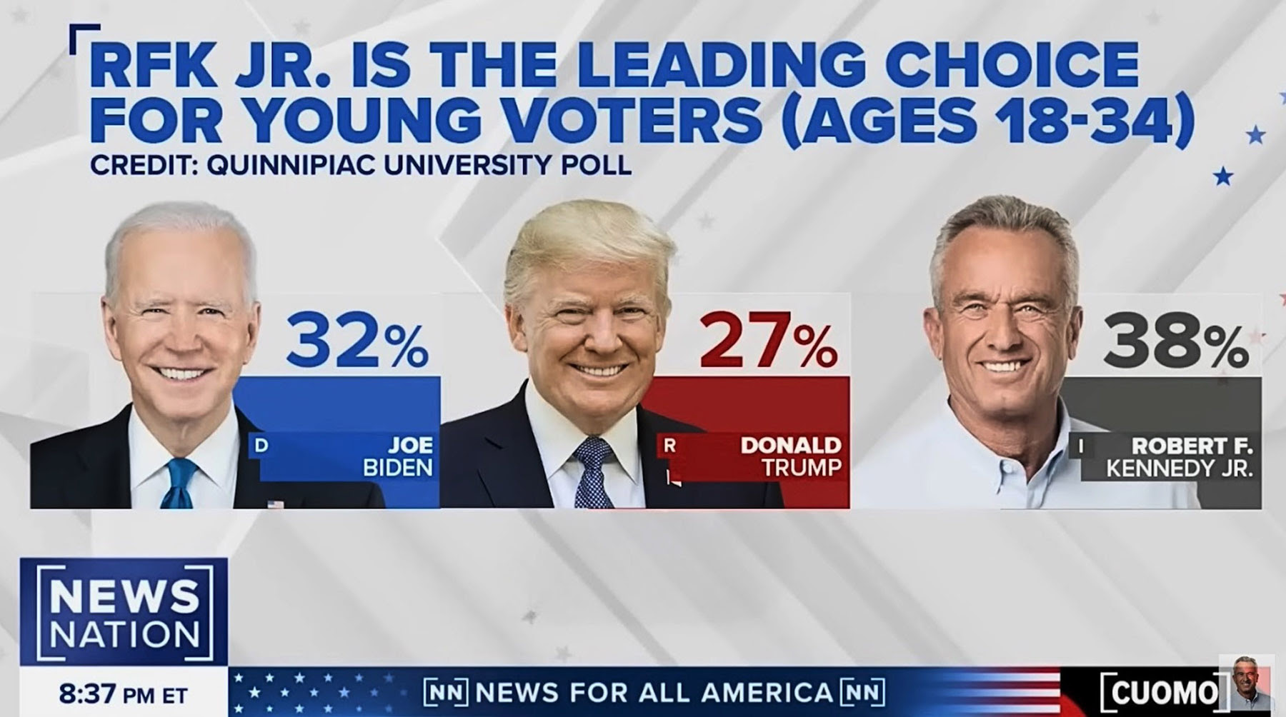 En general, Kennedy obtuvo el 32% de los votantes menores de 45 años, Biden el 30% y Trump el 29%. Sin embargo, otro estudio reciente de la Universidad de Quinnipiac encuestó a 1.610 votantes registrados autoidentificados. Kennedy obtuvo el 38 % del grupo demográfico, en comparación con Biden (32 %) y Trump (27 %), según la encuesta.