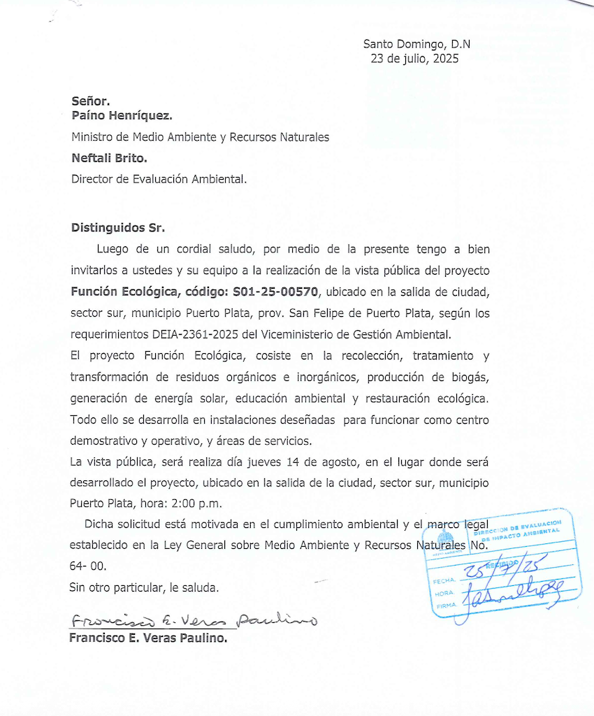El Faro Latino tuvo acceso a una carta remitida por el propio arquitecto Veras Paulino al ministro de Medio Ambiente, Paíno Henríquez, y a Neftalí Brito, director de Evaluación Ambiental, convocando a una vista pública este 14 de agosto en el lugar donde se planea la instalación.