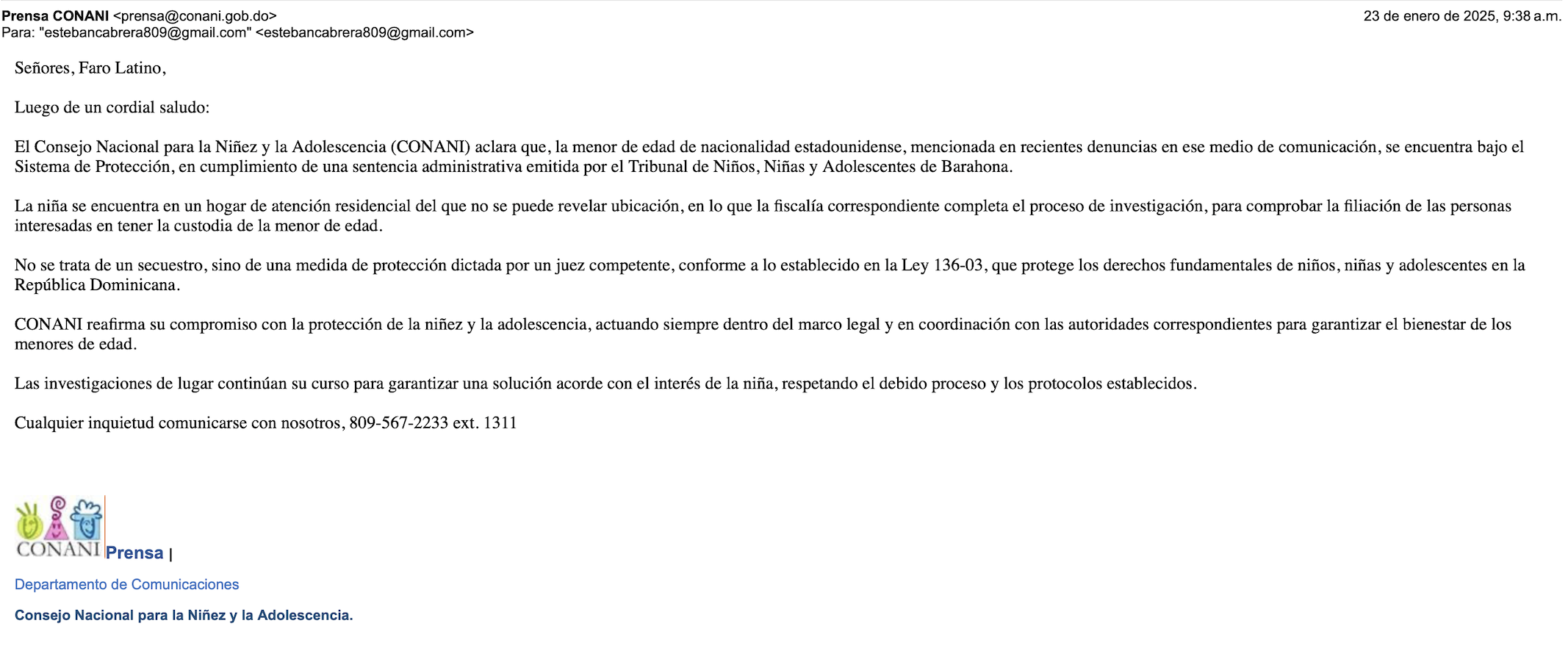 En una comunicación enviada al periódico El Faro Latino, el CONANI afirmó que la menor está bajo el Sistema de Protección en cumplimiento de una sentencia administrativa emitida por el Tribunal de Niños, Niñas y Adolescentes de Barahona.