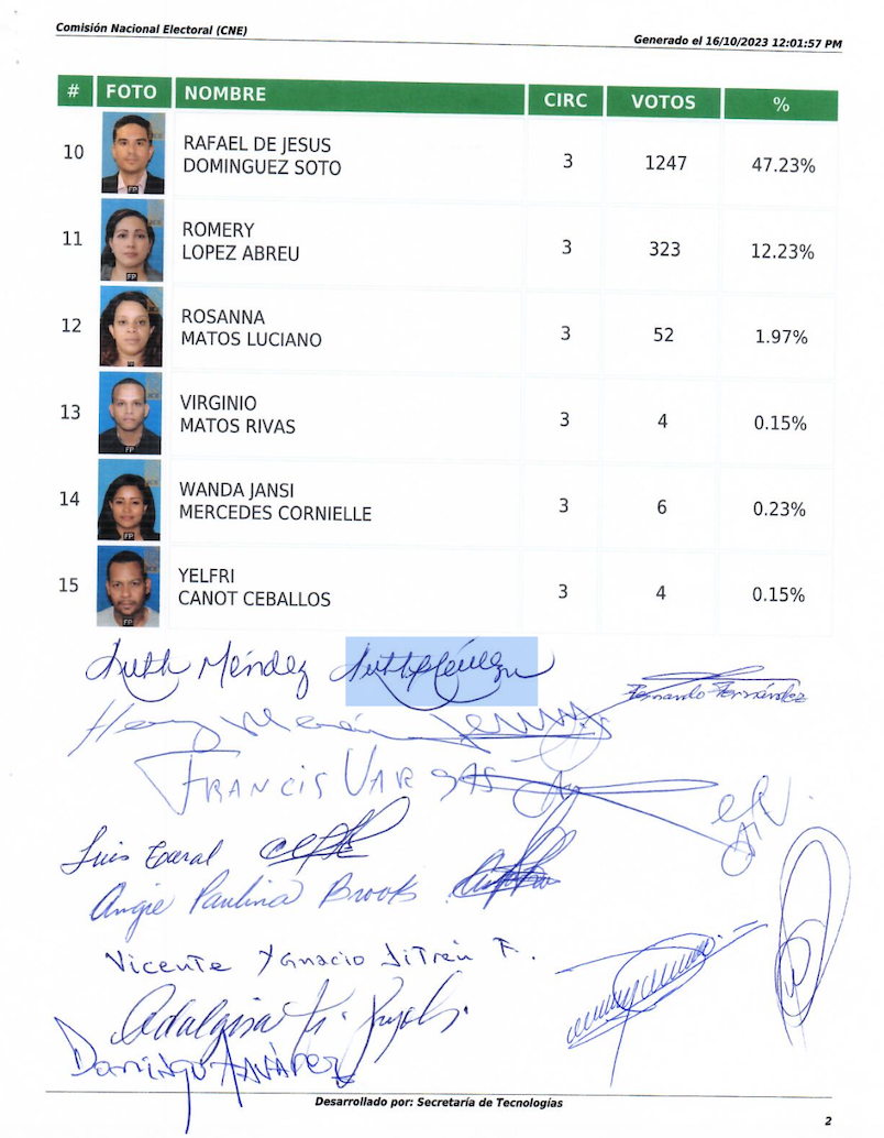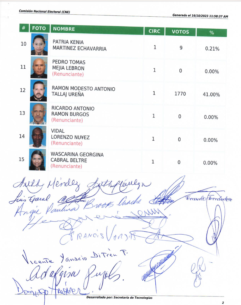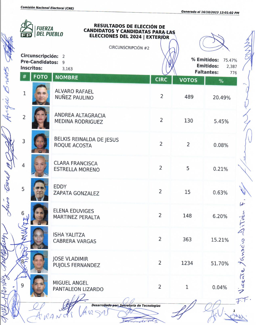 Por ejemplo, el acta de la circunscripción #1 que corresponde a Estados Unidos y Puerto Rico, establece que La Fuerza del Pueblo (FP) solo tiene inscritos en su padrón 6, 126 miembros y que, de esos, solo participó el 70.47% (unos 4, 317 votos emitidos). Asimismo, el documento revela que se abstuvieron de votar unos 1,809 personas.