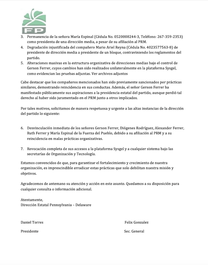 En el documento filtrado, Daniel Torres y José González, presidente y secretario general de la FP en Pennsylvania, respectivamente, solicitaron la desvinculación inmediata de Gerson Ferrer, Diógenes Rodríguez, Alexander Ferrer, Ruth Ferrer y María Espinal de la Fuerza del Pueblo, debido a su afiliación al PRM y su reincidencia en malas prácticas organizativas. Además, destacaron que estos dirigentes ya habían sido sancionados previamente por conductas similares, lo que demostraba su reincidencia.