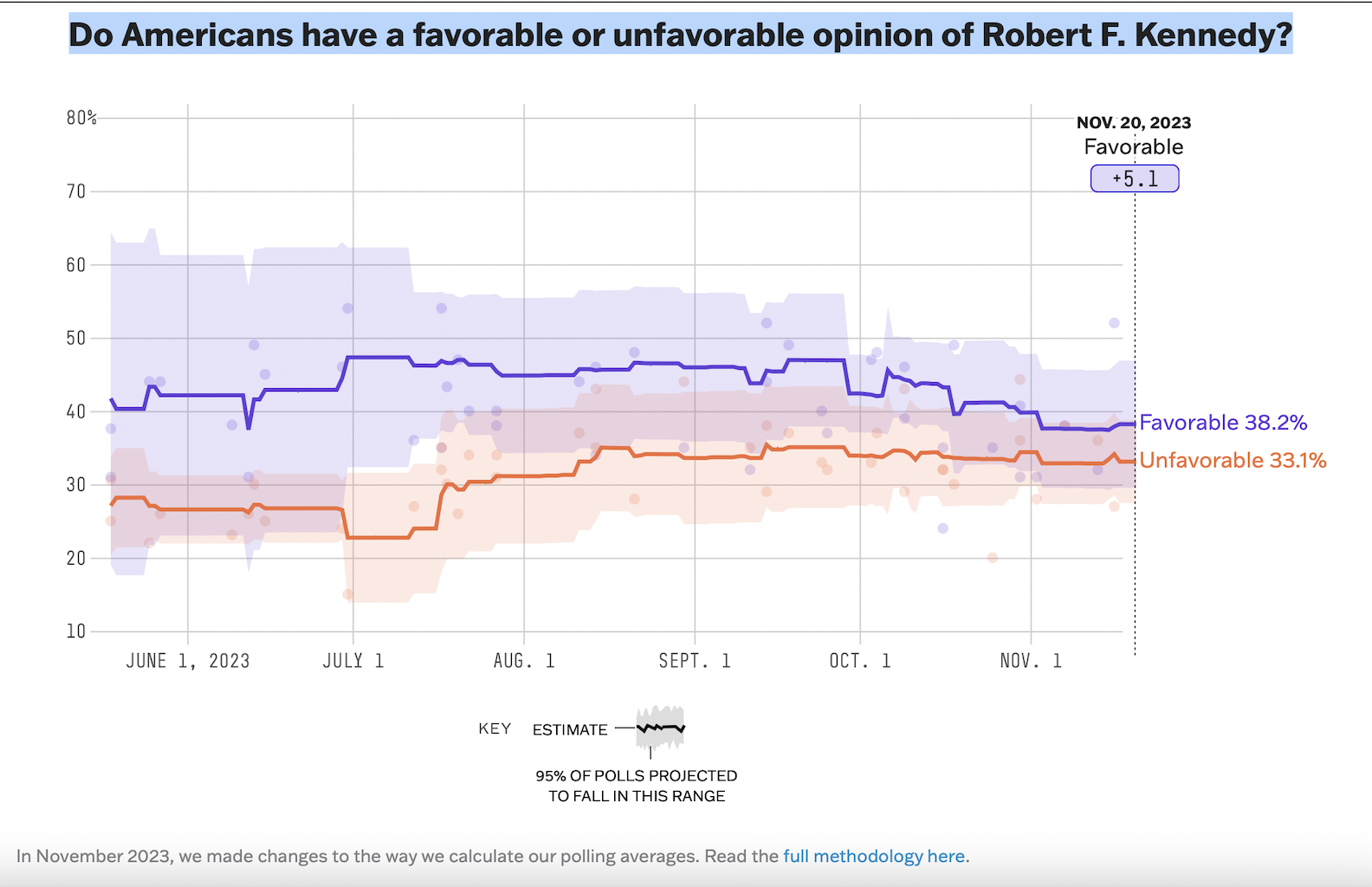 Siempre de acuerdo con el informe de “projects.fivethirtyeight.com”, al ser cuestionados sobre si ¿Tienen los estadounidenses una opinión favorable o desfavorable de Robert F. Kennedy? El 38.2% respondió favorablemente en contraposición del 33.1% que no le favoreció. Esta medición abarcó el período entre junio y noviembre de 2023.