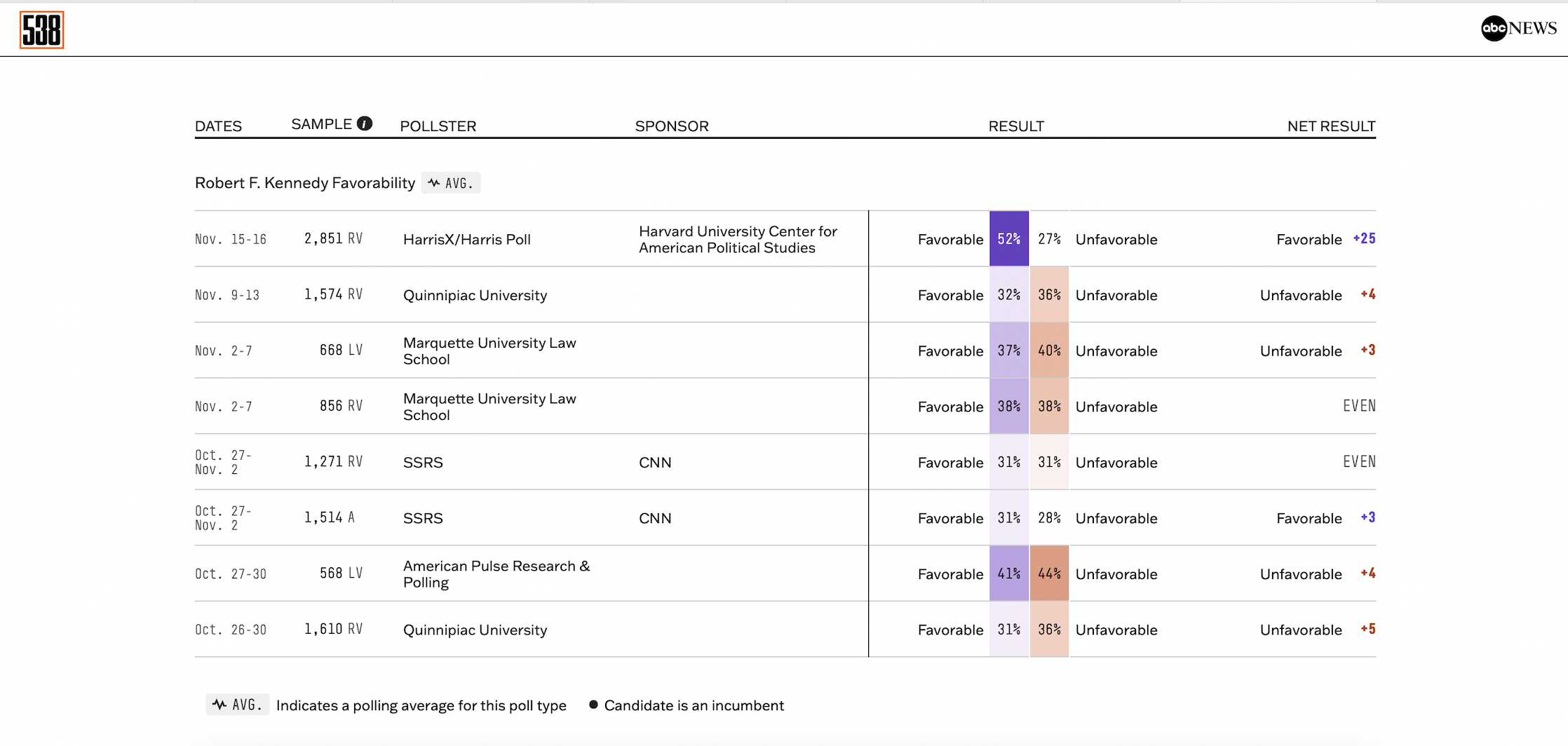 · Según el cuadro de average de “projects.fivethirtyeight.com”, la encuestadora Quinnipiac University, realizó una medición del 26 al 30 de octubre, que colocó a RFK JR con un 31% de favorabilidad contra un 36% en contra.