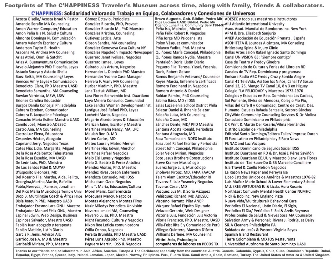 We are all one, and it is time to “GIVE THANKS for everything.” My memory preserves with great clarity four indelible marks that I share with you; Giving thanks today with you: • 1st. I already mentioned the first one in the first paragraph, and I also give thanks to my grandparents, who emigrated from Spain and France to the Dominican Republic, leaving in my veins and roots the mission to travel the world, learn, write, and continue sharing in various languages Footprints of “The C’HAPPINESS Traveler Museum” across time, with all who read this article, so that we may continue to integrate and create happiness on this planet.