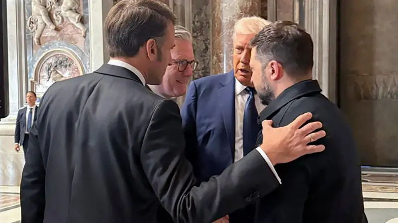 Otra imagen publicada por la delegación ucraniana desde el interior de la Basílica de San Pedro mostraba a los dos hombres de pie junto al primer ministro de Reino Unido, Keir Starmer, y el presidente francés, Emmanuel Macron, con la mano sobre el hombro de Zelensky.