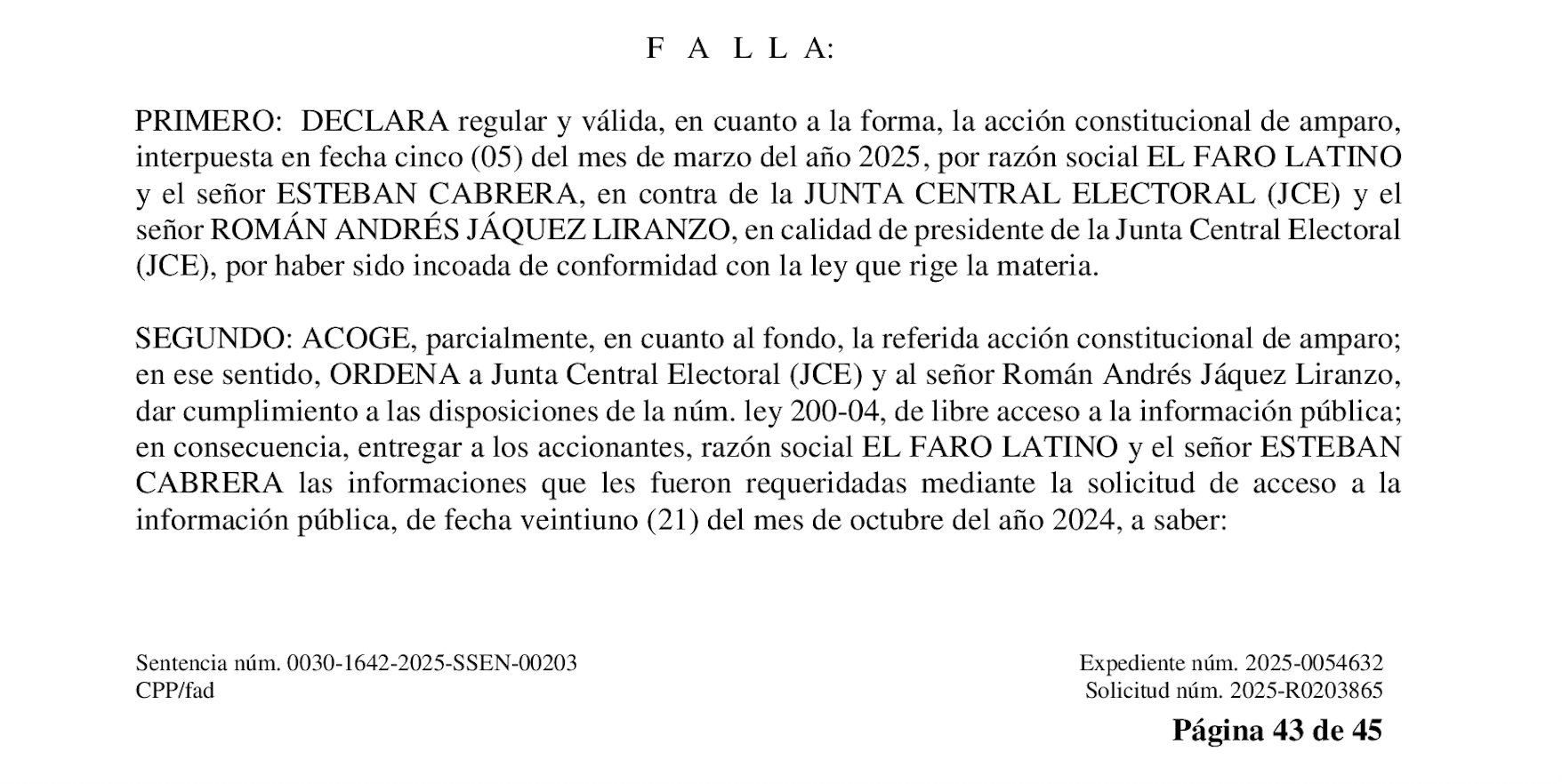 El momento decisivo de la sentencia llegó con la orden explícita del tribunal. En la página 44, la Cuarta Sala instruye a la Junta Central Electoral a entregar toda la documentación requerida por El Faro Latino y Esteban Cabrera.