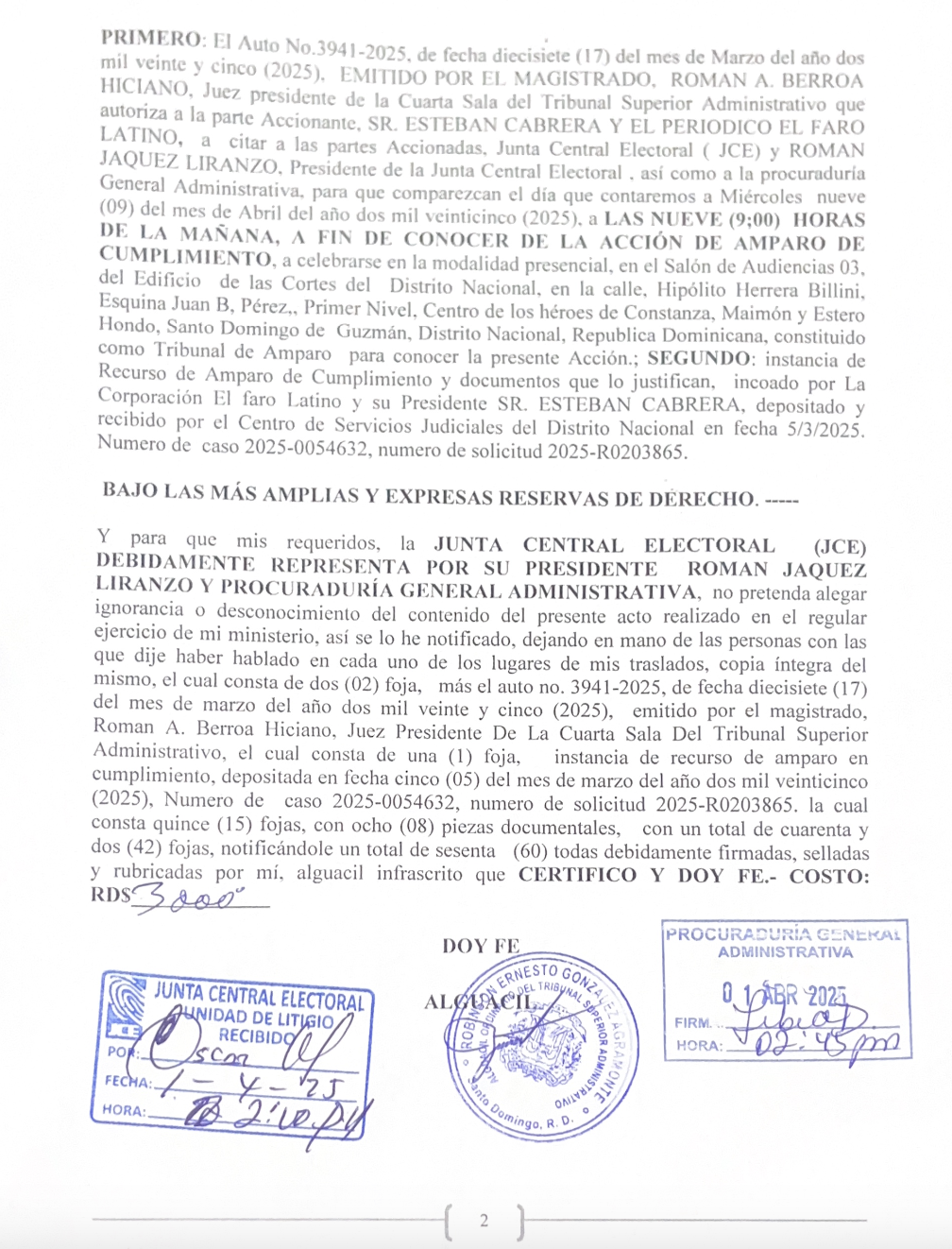 A través de esta acción, el ministerial Robinson González Agramonte, alguacil ordinario del Tribunal Superior Administrativo de la República Dominicana, notificó el Auto No. 3941-2025, emitido por el magistrado Román A. Berroa Hiciano, juez presidente de la Cuarta Sala del Tribunal Superior Administrativo. Este auto autoriza a la parte accionante, Sr. Esteban Cabrera y El Faro Latino, a citar a las partes demandadas: la Junta Central Electoral (JCE), su presidente Román Jáquez Liranzo, y la Procuraduría General Administrativa. Estas partes deberán comparecer el miércoles 9 de abril de 2025.