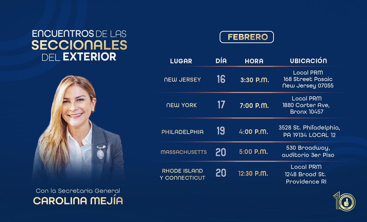 Carolina Mejía, además de ser alcaldesa de la ciudad más antigua del Nuevo Mundo, es secretaria general del PRM. En ese contexto, participó en una reunión a partir de las 4:00 p.m. en el local del PRM, ubicado en el 168 de Passaic Street, en Passaic, Nueva Jersey.