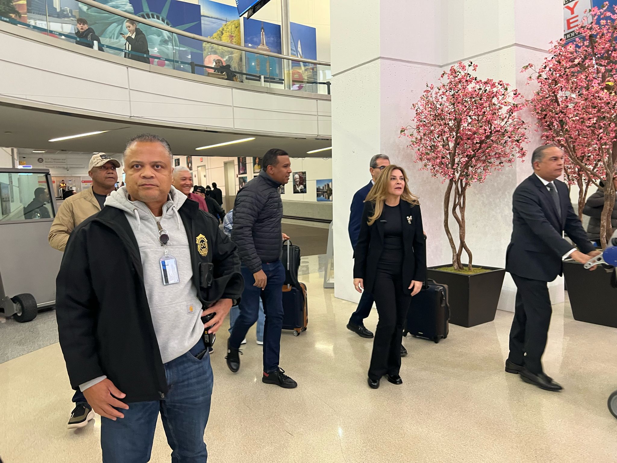 Junto a la alcaldesa Carolina Mejía también viajaron el Teniente General Carlos Luciano Díaz Morfa y el director de la OMSA, Radhamés González, quienes vienen a agotar una agenda oficial de una semana, fueron recibidos en la terminal aérea al son de “Ella es, ella es”, en alusión a su candidatura presidencial por el PRM en 2028.