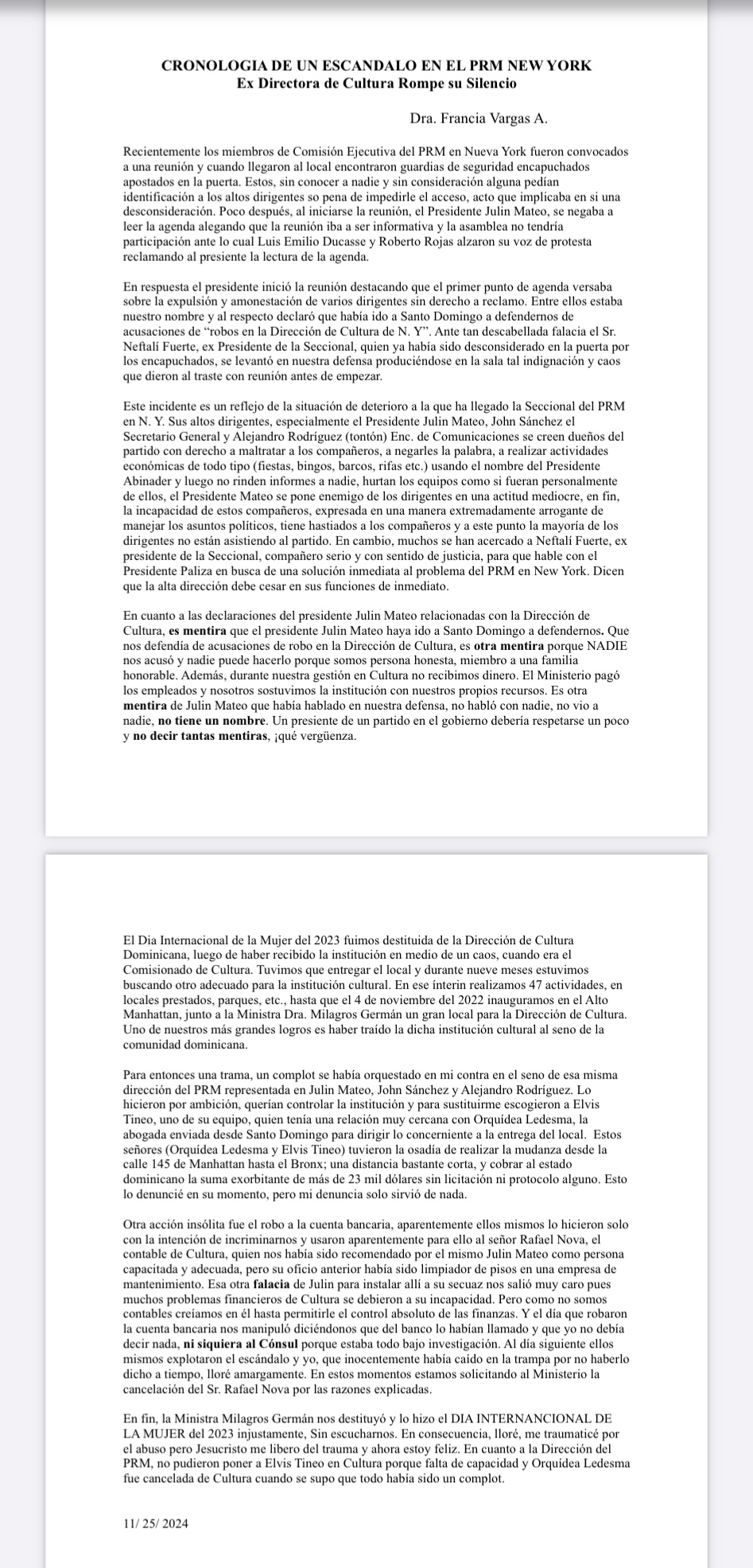 En una carta titulada “Cronología de un escándalo en el PRM new york, ex directora de cultura rompe su silencio”, a la que el periódico El Faro Latino tuvo acceso este martes 26 de noviembre, la Dra. Francia Vargas explica detalladamente lo sucedido durante la reunión que derivó en el escándalo que ha sacudido los cimientos del PRM en la República Dominicana y NY: