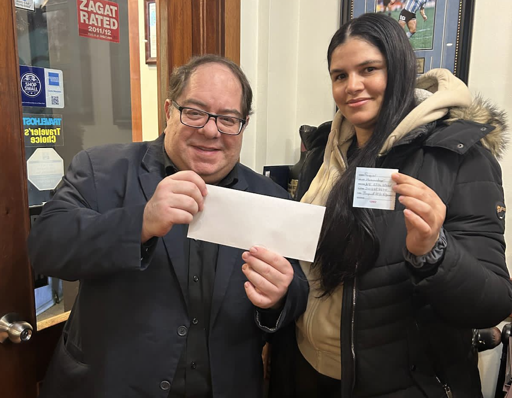- El gerente general de La Fusta NJ Steak House, Pablo Carballo, entrega el premio de dos boletos aéreos a la ganadora, Raquel Hernández.