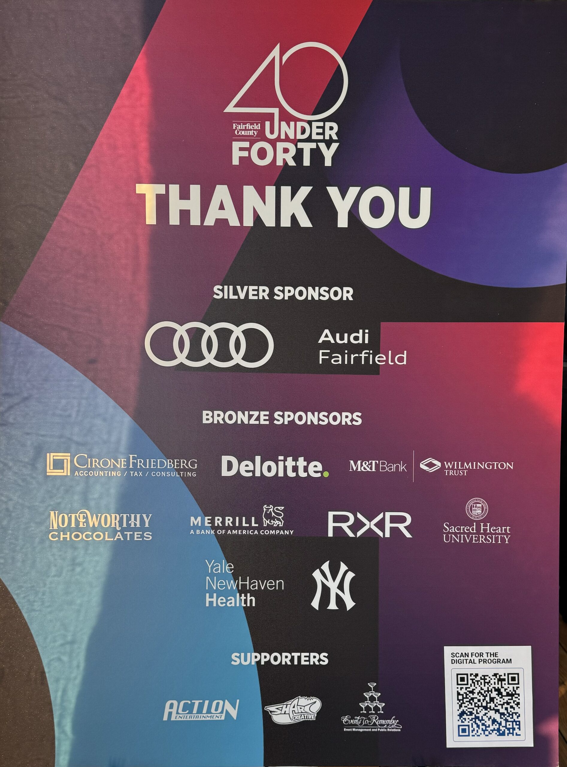 “Gracias y congratulaciones a los Condados de Fairfield ‘40 ganadores menores de 40 años’. Tus familias, tus compañeros de trabajo. Tu supervisor, tus amigos. Y gracias a Whisper Communications por hacer posible esta celebración. Necesitamos más de esto. Un amigo lo describió recientemente como Sentimiento y su determinación”, dijo Nelson Merchan, uno de los jueces que hizo posible la escogencia de los 40 jóvenes galardonados.